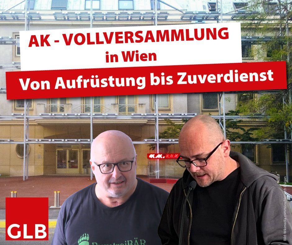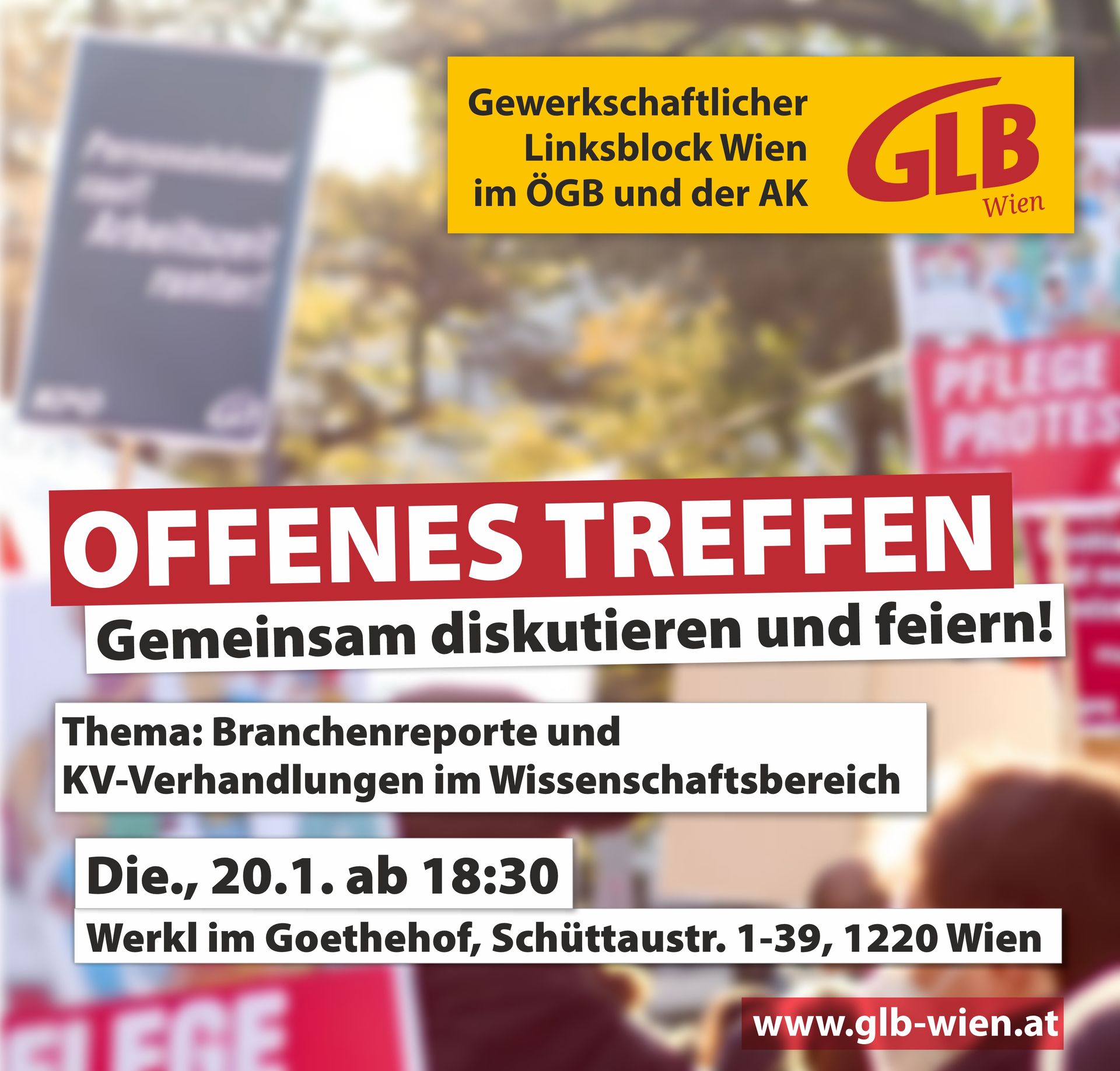 Wir freuen uns über interessierte und kämpferische Lohnarbeitsabhängige Menschen! Sei dabei, diskutiere und plane mit uns konkrete Aktivitäten! Anschließend gemütliches Zusammensein. Offenes Treffen des GLB Wien: Thema: Branchenreporte und KV-Verhandlungen im Wissenschaftsbereich. Kurzer Input von GLB-Gewerkschafter:innen und anschließende Diskussion. Die., 20.1. ab 18:30 im Werkl im Goethehof (Schüttaustraße 1-39, 1220 Wien - U1 Kaisermühlen, 5 Minuten Fußweg - Gassenlokal mit Roter Eingangstüre am Goethehof)
