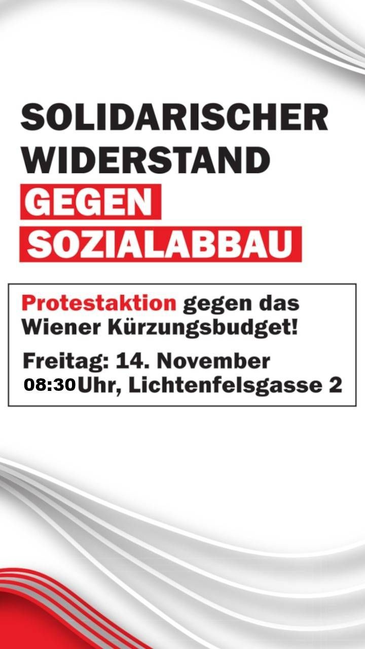 Am Freitag, den 14.11. präsentiert die Stadtregierung ein Budget, in dessen Rahmen etwa die Mindestsicherung für Kinder gekürzt und für subsidär Schutzberechtigte ganz abgeschafft werden soll. Quer durch den Sozialbereich werden Projekte eingestellt und Leute gefeuert, von der Drogen- und Suchthilfe bis zu Deutschkursen. Den Obdachloseneinrichtungen wird sogar das warme Mittagessen gestrichen. Alle jetzt schon angekündigten Kürzungen hier zu erwähnen würde den Rahmen sprengen, aber kurz lässt sich sagen: *Zehntausende Menschen sind durch dieses Budget akut von Armut und Elend bedroht* Auch im WiGeV soll gespart werden, nachdem dort bereits durch das aufgeschnürte Gehaltsgesetz massive Reallohnverluste, auch für die Pflege, real sind. In den anderen Bereichen der öffentlichen Daseinsvorsorge sieht es nicht anders aus, Mistkübler, Hausbetreuer:innen, Sozialarbeiter:innen, etc. Weitere Einsparungen sind in Planung. Wir wollen das nicht hinnehmen, *daher raus auf die Straße*. Wir werden bei der *Verkündung des Budgets der Stadt Wien* am *Freitag dem 14.11. ab 08:30 bei der Lichtenfelsgasse 2 (Rathaus)* der Stadtregierung richtig einheizen. Das wird nur der erste Schritt sein. Wir, das Bündnis SoWi_So - Solidarischer Widerstand gegen Sozialkürzungen , planen für die kommenden Monate weitere Aktionen, etwa eine Konferenz gegen die Kürzungen und Demonstrationen. Komm am Freitag, nimm alle mit die du kennst und die Zeit haben. Melde dich wenn du mit uns aktiv werden willst: sowiso.wien@gmail.com