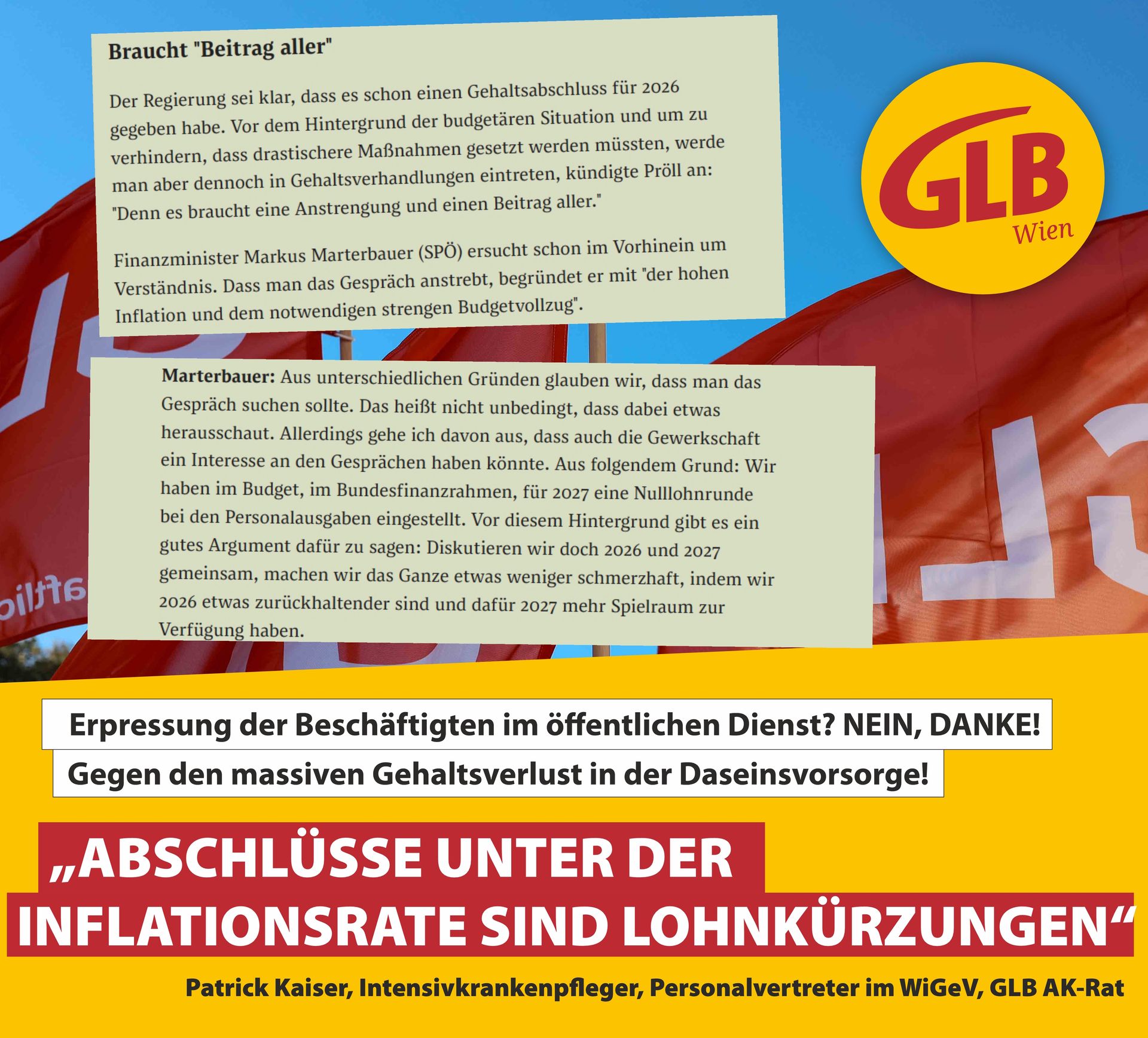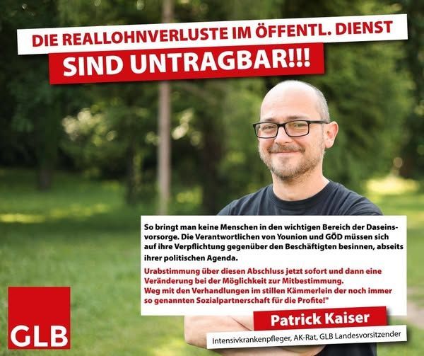 Patrick Kaiser, AK-Rat für den GLB in Wien, Personalvertreter im WiGeV (öffentliche Wiener Spitäler) und aktiver Intensivkrankenpfleger, meint: „Younion und GÖD dürfen sich nicht erpressen lassen! Wir haben bereits eine schlechte Vereinbarung über 0,3 % über der Inflationsrate nach Verlusten zuvor. Wenn dies aufgeschnürt wird, muss es gewerkschaftliche Kampfmaßnahmen geben, für alle Beschäftigten in der Daseinsvorsorge. Wir sind bereit!”