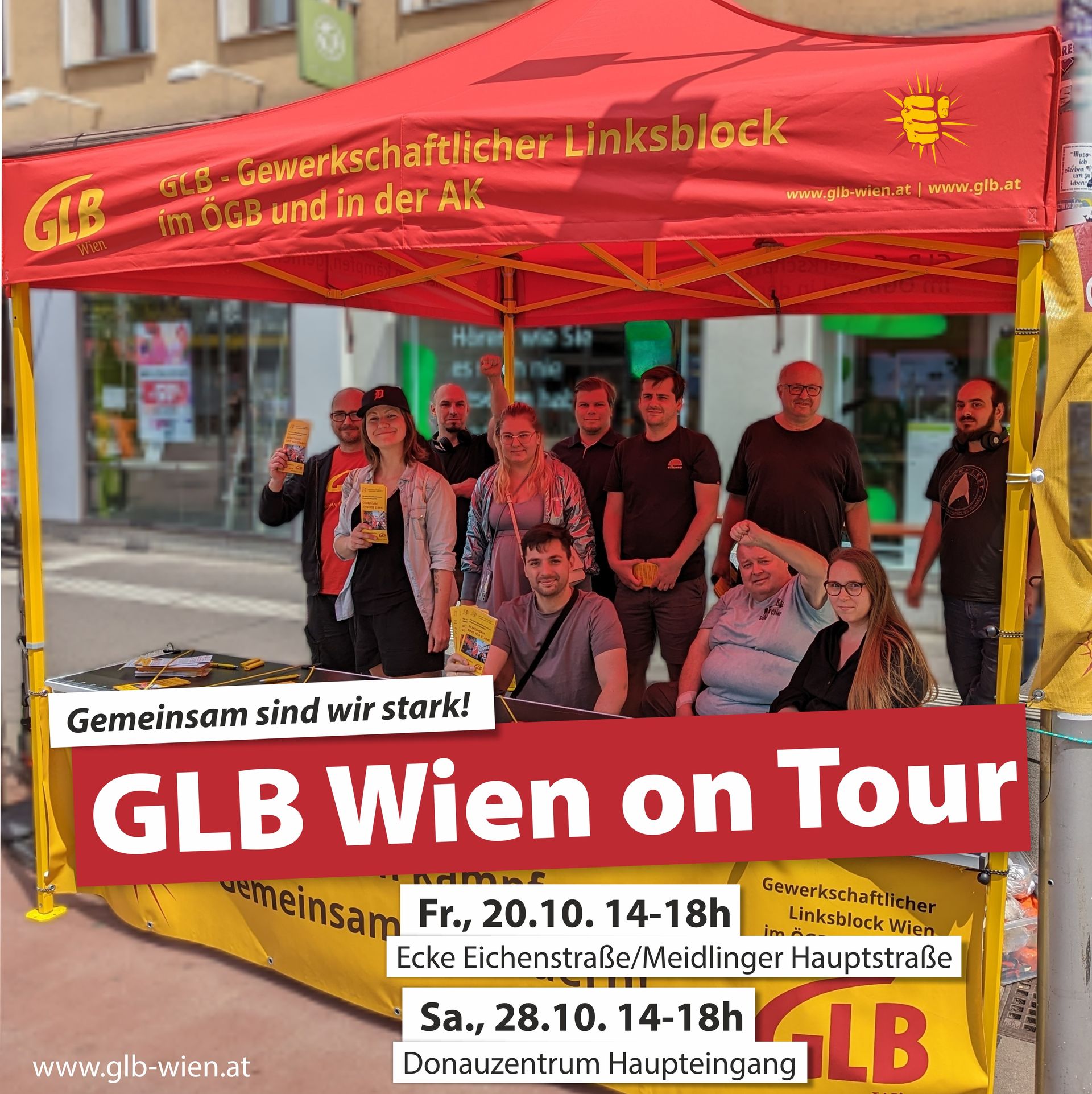 GLB Wien ist wieder "on Tour" auf der Straße und in den Betrieben! Wir informieren und sammeln Unterstützungserklärungen, um eine wirklich linke Alternative bei der Arbeitkammerwahl 2024 zu ermöglichen. Mach mit, sei dabei! Gemeinsam sind wir stark!